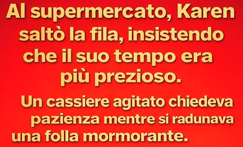 Nel frattempo, la folla che si era radunata già commentava l’accaduto, ognuno con la propria opinione. Alcuni annuivano in approvazione, altri scrollavano le spalle concentrandosi sulla spesa in silenzio. Karen sperava che almeno qualcuno non la giudicasse troppo duramente dietro sorrisi gentili.