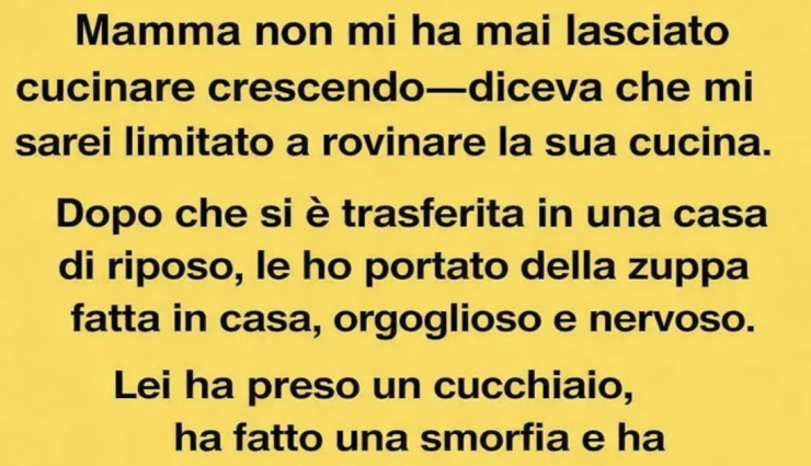 La mamma non mi ha mai permesso di cucinare mentre crescevo—diceva che avrei rovinato la sua cucina. Anni dopo, dopo che si è trasferita in una struttura di assistenza, le ho portato con orgoglio una zuppa fatta in casa. L’ha assaggiata, ha fatto una smorfia e ha borbottato: “Figuriamoci se non rovini anche questa.” Io ho sorriso, ma dentro mi sono spezzata.