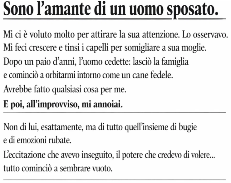 Non di lui, esattamente, ma di tutto quell’insieme di bugie e di emozioni rubate. L’eccitazione che avevo inseguito, il potere che credevo di volere… tutto cominciò a sembrare vuoto. Avevo passato tanto tempo a desiderare ciò che non era mio, che quando finalmente lo ebbi, non sapevo cosa farne.