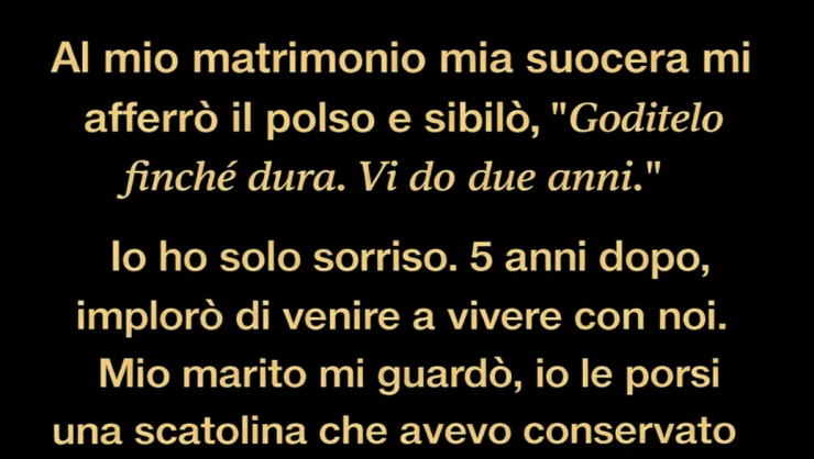 Mia suocera mi afferrò il polso al mio matrimonio e sibilò: “Goditelo finché dura. Ti do 2 anni.” Io sorrisi soltanto. Cinque anni dopo, lei mi supplicò di trasferirsi da noi. Mio marito mi guardò. Io le consegnai una scatola che avevo tenuto dal giorno del nostro matrimonio proprio per questo momento. Lei la aprì e sussultò. Dentro c’era una piccola pila di buste, legate con lo stesso nastro avorio del mio bouquet da sposa.
