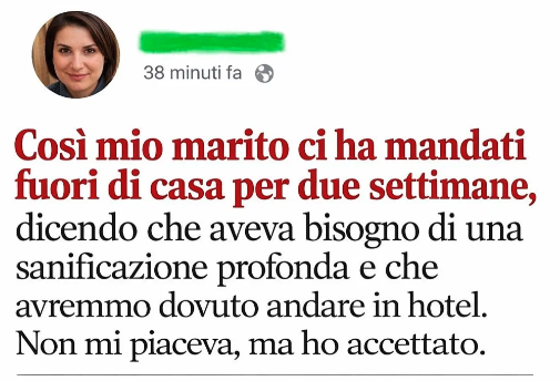 Disse che gli specialisti avevano consigliato di lasciare la casa per due settimane per una “disinfezione profonda”. Aveva già prenotato un hotel in centro con piscina coperta e colazione inclusa. Sembrava tutto troppo organizzato, ma non discutemmo.