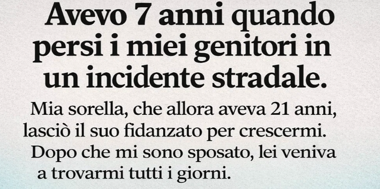 Avevo 7 anni quando ho perso i miei genitori in un incidente d’auto. Mia sorella (allora 21enne) lasciò il suo fidanzato per crescermi. Dopo che mi sono sposato, veniva a trovarmi — ogni giorno. Un giorno sbottai: «Non sono tuo figlio! Vai a farti una famiglia tutta tua!». Per settimane nessuna notizia. Pensai fosse solo arrabbiata. Poi un giorno andai da lei. Entrai e mi bloccai.