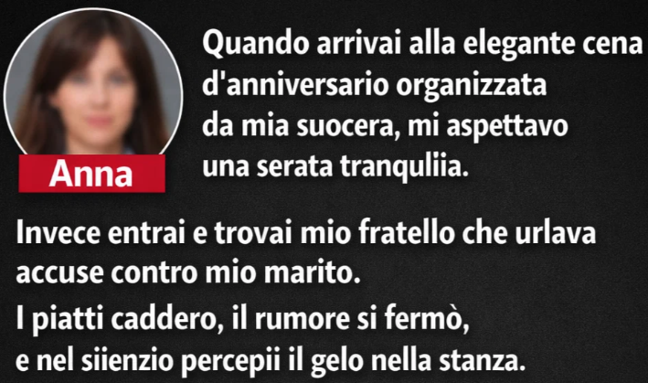 Quando arrivai alla elegante cena d’anniversario organizzata da mia suocera, mi aspettavo una serata tranquilla. Invece entrai e trovai mio fratello che urlava accuse contro mio marito. I piatti caddero, il rumore si fermò, e nel silenzio percepii il gelo nella stanza.