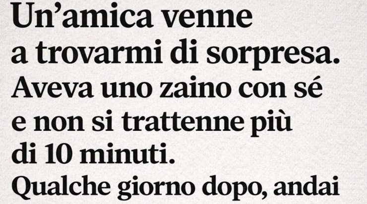Me ne sono andato in fretta, fingendo di avere un impegno. Per tutto il tragitto di ritorno a casa, i miei pensieri continuavano a girare: perché la visita improvvisa con uno zaino? Perché il nervosismo? Perché quel giorno non si è nemmeno seduta per bene?