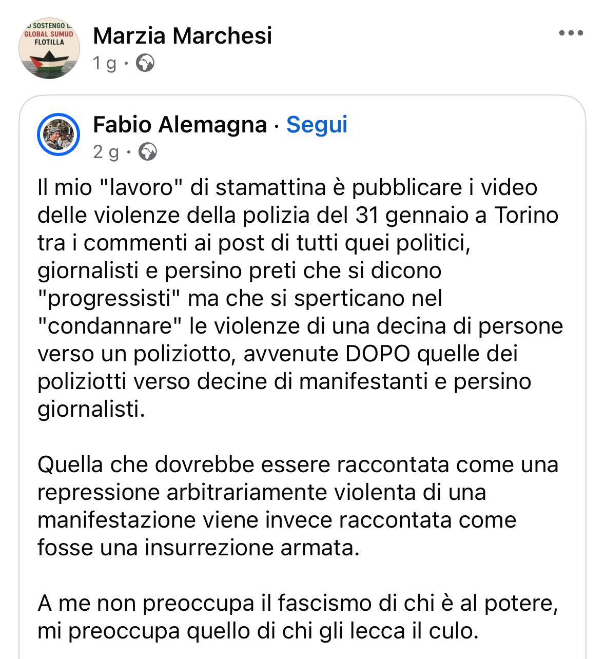 Il contenuto oggetto di attenzione non è stato redatto direttamente dall’Assessora, bensì condiviso sul suo profilo Facebook. Nel post, l’Assessora Marchesi afferma: “Il mio compito di questa mattina consiste nel pubblicare i video delle violenze commesse dalla polizia il 31 gennaio a Torino, tra i commenti ai post di tutti quei politici, giornalisti e persino preti che si definiscono ‘progressisti’, ma che si prodigano nel ‘condannare’ le violenze perpetrate da una decina di individui nei confronti di un agente di polizia, avvenute successivamente alle violenze commesse dai poliziotti nei confronti di decine di manifestanti e persino giornalisti. Ciò che dovrebbe essere descritto come una repressione arbitrariamente violenta di una manifestazione viene invece presentato come un’insurrezione armata. Non mi preoccupa il fascismo di chi detiene il potere, bensì quello di chi gli si accoda servilmente”.