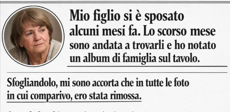 Mio figlio si è sposato qualche mese fa. Il mese scorso sono andata a trovarli e ho visto un album di famiglia sul tavolo. Sfogliandolo, mi sono accorta che tutte le foto in cui comparivo io erano sparite. Quando ho chiesto spiegazioni a mia nuora, mi ha detto che aveva realizzato quell’album per la sua famiglia e che non mi aveva inclusa perché “loro non saprebbero chi sei”.