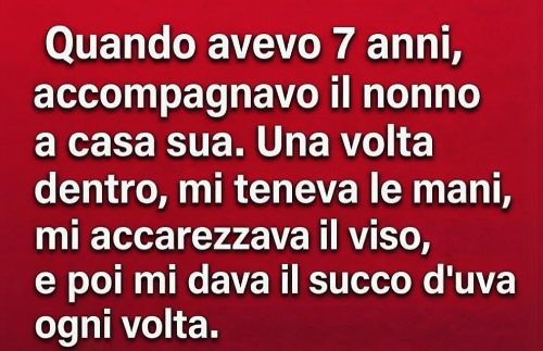 Mi sembravano importanti, anche se non avrei saputo spiegare il perché. Camminavo accanto a lui dal negozio all’angolo fino alla sua piccola casa in fondo all’isolato, con la mia mano avvolta con fiducia nella sua, come se fossi io a garantire che arrivassimo sani e salvi. Una volta dentro, tutto si svolgeva sempre allo stesso modo. Mi prendeva le mani, osservava il mio viso con attenzione premurosa e sorrideva dolcemente prima di versare due bicchieri di succo d’uva. Parlava di rado, ma il modo in cui si concentrava su di me rendeva la stanza calma e protetta. Per me, era solo la nostra abitudine privata, una pausa gentile in un’infanzia altrimenti ordinaria.