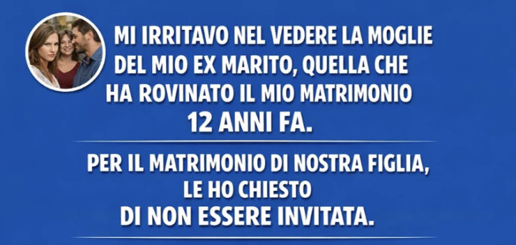 Mi irrita vedere la moglie del mio ex marito, che ha rovinato il mio matrimonio 12 anni fa. Per il matrimonio di nostra figlia, ho chiesto che non fosse invitata. Ma lui l’ha portata, dicendo: «Dove vado io, va la mia moglie!». Io ho replicato: «Io sono la mamma della sposa. Non la voglio qui!». Lei ha sorriso ed è uscita. Prima di percorrere la navata, ho sentito mia figlia urlare. Sono corsa da lei e l’ho trovata seduta per terra con il suo abito bianco, il mascara che colava sul viso.