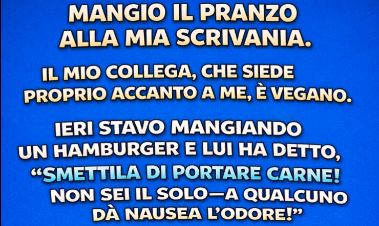 “Mangio il pranzo alla mia scrivania. La mia collega, che lavora proprio accanto a me, è vegana. Ieri stavo mangiando un hamburger quando lei ha detto: ‘Smettila di portare carne! Non sei solo—alcuni di noi si sentono male per l’odore.’ Stamattina sono arrivato in ufficio e sono rimasto impietrito. Ho visto che le Risorse Umane avevano…”