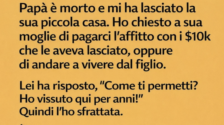 Quando mio padre è morto, mi ha lasciato la sua piccola casa. Inoltre, ha lasciato a sua moglie — la mia matrigna — 10.000 dollari in contanti. Credevo che l’accordo fosse chiaro: poteva usare quel denaro per pagare un affitto e restare nella casa, oppure trasferirsi da suo figlio.
