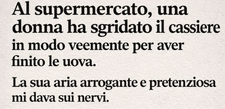 Al supermercato, una donna rimproverava ad alta voce la cassiera perché erano finite le uova. Il suo tono compiaciuto e arrogante mi irritava. Mi sono spostata nella fila accanto, ma lei mi ha seguita, pretendendo: “Non sa chi sono io?” Mentre mi si infilava davanti, è apparso il direttore e le ha detto con calma: “Facciamo un passo da parte e risolviamo la questione amichevolmente.” L’intero negozio è sembrato tirare un sospiro mentre la conduceva via, il suo atteggiamento paziente che gettava un incantesimo silenzioso sulla situazione tesa.
