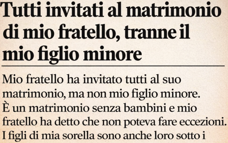Era un matrimonio “child-free”, mi disse mio fratello. Niente eccezioni. Anche i figli di mia sorella sono minorenni, quindi pensai che anche loro sarebbero stati esclusi.