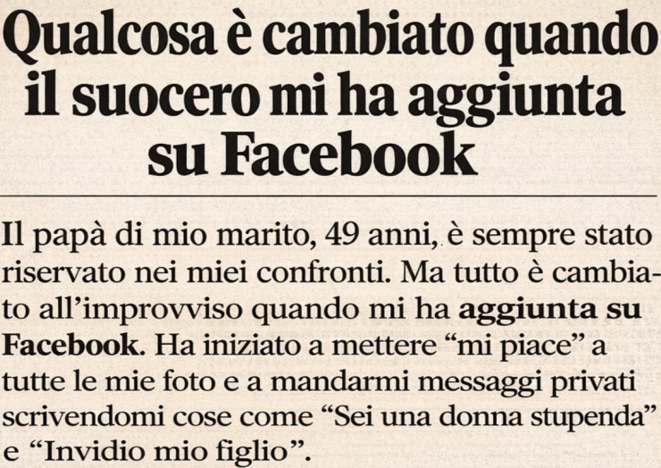 Il padre di mio marito, 49 anni, è sempre stato riservato nei miei confronti. Ma qualcosa è cambiato quando mi ha aggiunta su Facebook. Ha iniziato a mettere “mi piace” a tutte le mie foto e a mandarmi messaggi privati tipo: “Sei una donna bellissima” e “Invidio mio figlio.”
