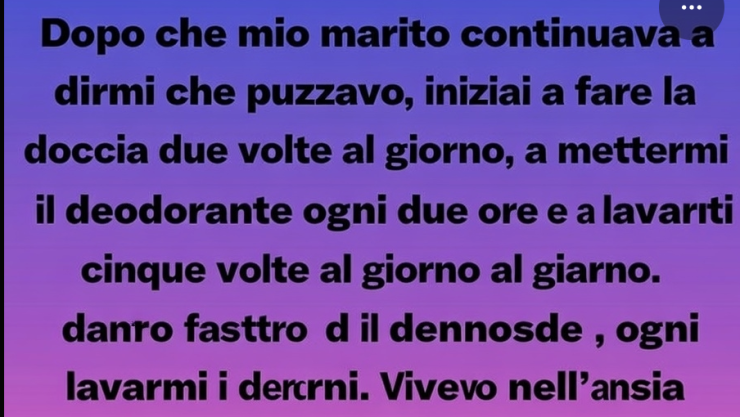 Dopo che mio marito continuava a ripetermi che avevo un cattivo odore, iniziai a fare la doccia due volte al giorno, a mettermi il deodorante ogni due ore e a lavarmi i denti cinque volte al giorno. Vivevo in uno stato di allerta costante, ossessionata da ogni minimo dettaglio del mio corpo.