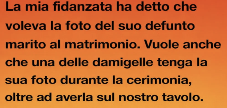 La mia fidanzata mi disse che voleva la foto del suo defunto marito al matrimonio. Non solo: voleva che una delle damigelle tenesse il suo ritratto durante la cerimonia, che la foto fosse sul nostro tavolo e che, durante il servizio fotografico, fosse lei a tenerla in mano nella maggior parte delle immagini.