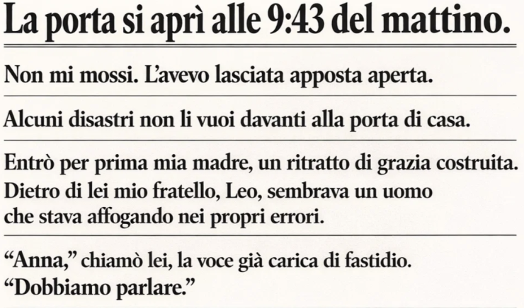 Entrò per prima mia madre, un ritratto di grazia costruita. Dietro di lei mio fratello, Leo, sembrava un uomo che stava affogando nei propri errori.