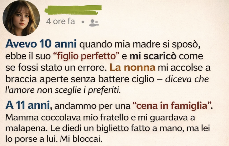 Lei diventò tutto—la mia casa, la mia sicurezza, la prova che io contavo qualcosa. Mi insegnò a cucinare, a risparmiare, a sopravvivere alle delusioni senza lasciare che mi trasformassero in amarezza.