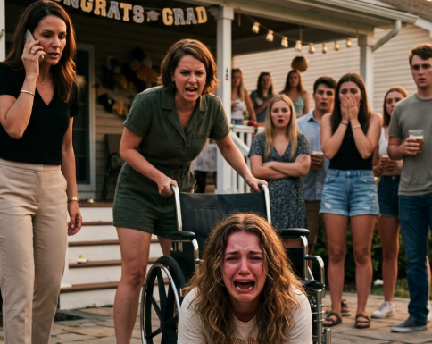 Strattonò la mia sedia a rotelle con forza — così violentemente che una ruota si sollevò da terra e io venni scaraventata sul patio di pietra. La mia spalla colpì per prima, poi l’anca. Un vassoio cadde accanto a me, i bicchieri si frantumarono e il cibo si sparse sul mio vestito.