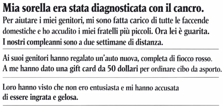 Mia sorella ha ricevuto un’auto. Io una gift card da 50 dollari.