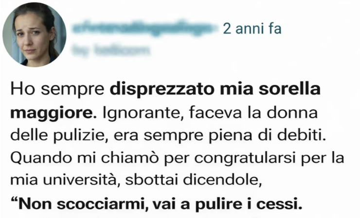 Passarono tre mesi. Nessuna chiamata. Nessun messaggio. Mi convinsi che fosse arrabbiata, che avesse bisogno di tempo. E poi io ero impegnata—nuovo lavoro, nuova città, nuova vita. A volte sentivo un pizzico di colpa, ma lo scacciavo. Lei era forte. Era sempre stata forte.