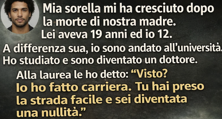 Gli anni passarono. Andai bene a scuola, studiai con impegno. Passo dopo passo, seguii il percorso che tutti si aspettavano da me: università, medicina, specializzazione. Ogni successo mi sembrava la prova che i suoi sacrifici erano valsi la pena.