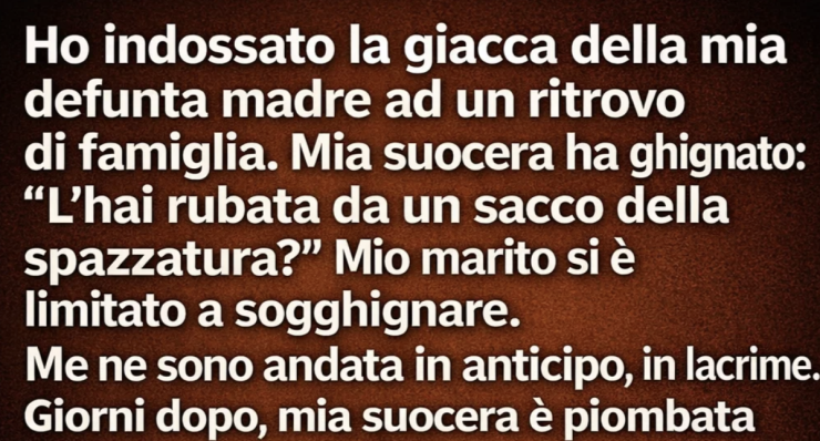 Durante la cena, mia suocera notò la giacca e fece una battuta crudele, dicendo che sembrava presa dalla spazzatura. Qualcuno rise, in modo imbarazzato. Io guardai mio marito, sperando che mi difendesse, che dicesse qualcosa. Invece rimase in silenzio. Peggio ancora: sorrise.