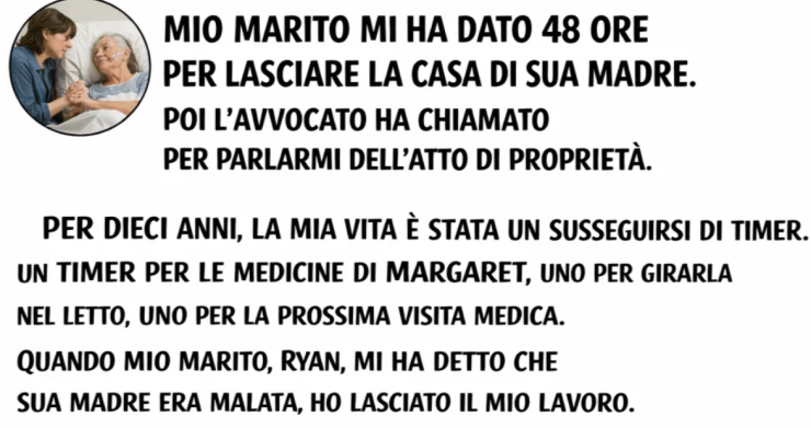 Per dieci anni, la mia vita è stata un susseguirsi di timer. Un timer per le medicine di Margaret, uno per girarla nel letto, uno per la prossima visita medica. Quando mio marito, Ryan, mi ha detto che sua madre era malata, ho lasciato il mio lavoro.