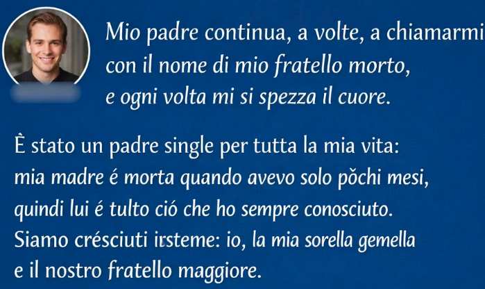A luglio dello scorso anno, nostro fratello è morto in un incidente d’auto. Da allora, papà a volte mi chiama con il suo nome. La prima volta l’ho corretto, e lui mi ha risposto che sapeva benissimo che nostro fratello non c’era più… ma che sentiva il bisogno di pronunciare ancora il suo nome, perché gli manca terribilmente. Gli manca quel bambino che teneva tra le braccia, a cui cantava per farlo addormentare. E in quel momento, il mio papà – il mio papà sempre forte – è crollato, in lacrime, davanti a me. E il cuore si è spezzato anche a me.