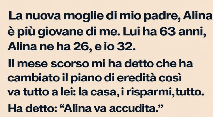 Dopo quell’episodio, Alina ha evitato completamente ogni contatto con me. Mio padre e lei bisbigliavano negli angoli, sbattevano porte, litigavano così forte che si sentiva da fuori quando passavo da quelle parti. La tensione tra loro era innegabile. Lui mi ha accusata di “rovinare la pace,” ma io non vedevo come *insistere su ciò che era legalmente — e moralmente — mio potesse essere un crimine.
