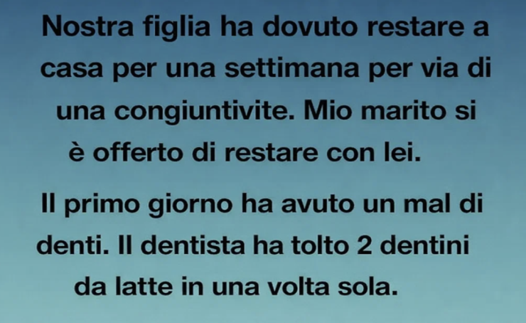 Nostra figlia ha dovuto restare a casa per una settimana a causa di una congiuntivite. Mio marito si è offerto di restare con lei. Il primo giorno le è venuto mal di denti: il dentista le ha tolto due dentini da latte in una sola volta. Il secondo giorno ha iniziato a tossire. Così mio marito si è ritrovato a curarle gola, denti e occhi. Il terzo giorno ha detto che le mancavo.