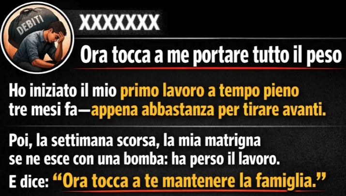 Ho iniziato il mio primo lavoro a tempo pieno tre mesi fa—appena abbastanza per tirare avanti. Poi, la settimana scorsa, la mia matrigna se ne esce con una bomba: ha perso il lavoro. E dice: “Ora tocca a te mantenere la famiglia.”