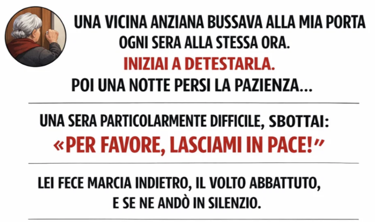 La sera successiva, bussò di nuovo. Stessa ora. Stavolta mi chiese se avevo visto un gatto randagio—che non esisteva. La notte seguente si lamentò dei passi sopra il soffitto—peccato che io abitassi sotto di lei.