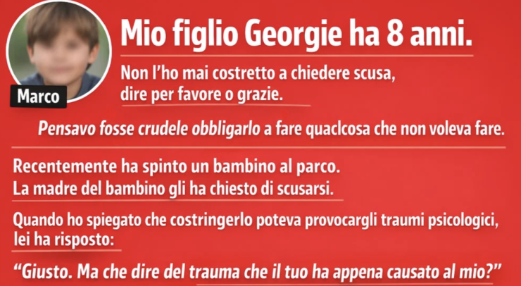 Mio figlio Georgie ha 8 anni. Non l’ho mai costretto a chiedere scusa, dire per favore o grazie. Pensavo fosse crudele obbligarlo a fare qualcosa che non voleva fare.