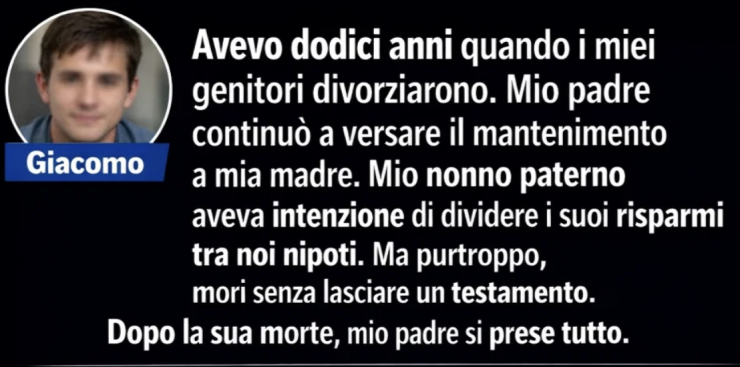 Avevo dodici anni quando i miei genitori divorziarono. Mio padre continuò a versare il mantenimento a mia madre. Mio nonno paterno aveva intenzione di dividere i suoi risparmi tra noi nipoti. Ma purtroppo, morì senza lasciare un testamento. Dopo la sua morte, mio padre si prese tutto.
