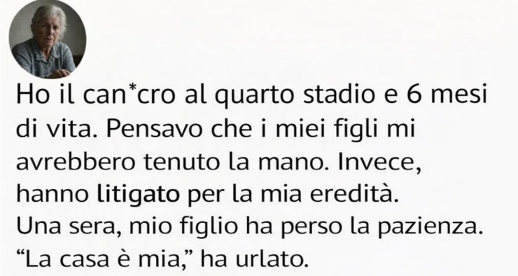 E anche allora, qualcosa non tornava. Erano presenti, ma distratti. Più di una volta, la conversazione finì su documenti, proprietà, su cosa sarebbe successo dopo la mia morte. Una sera, mio figlio urlò che la casa spettava a lui.