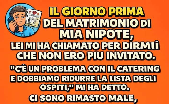 La telefonata arrivò il pomeriggio prima del matrimonio, mentre stavo piegando il bucato e ripassando mentalmente il mio discorso di auguri. Mia nipote sembrava nervosa, la voce tesa in un modo che non sentivo da quando era adolescente e chiedeva il permesso per usare la macchina. Mi spiegò che c’era stato un problema con il catering, un limite imprevisto e alcune decisioni difficili. Quando finì di parlare, il messaggio era chiaro: non ero più invitata. Rimasi seduta lentamente, il telefono ancora all’orecchio, mentre assimilavo le parole. Mi ferì più di quanto mi aspettassi, non tanto per la festa in sé, ma per ciò che rappresentava—un momento che avevo immaginato da quando lei era piccola e che speravo di vivere con lei.