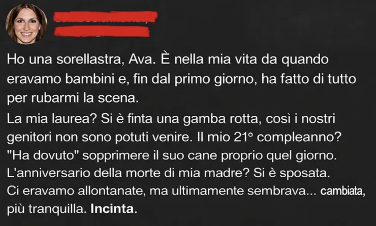Entrò nella mia vita quando avevo nove anni e lei dieci. I nostri genitori si erano sposati dopo aver attraversato divorzi complicati, e per un po’ ero entusiasta di avere una “sorella”. Ma tutto ciò finì rapidamente. Fin dall’inizio, Ava si comportò come se fossimo in una sorta di strana competizione.