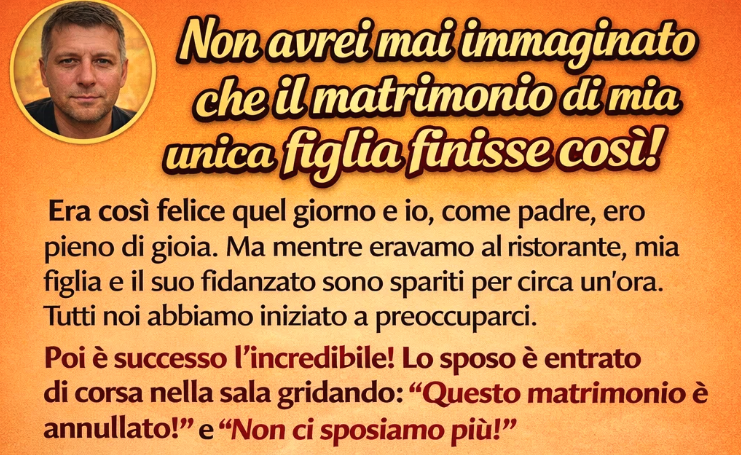 Non avrei mai immaginato che il matrimonio della mia unica figlia potesse finire così. Quella mattina era raggiante, attraversava la cerimonia con quella felicità che ogni genitore sogna di vedere nel proprio figlio. Come padre, vederla percorrere la navata mi riempì d’orgoglio al punto da togliermi il respiro. Quando arrivammo al ristorante per il ricevimento, tutto sembrava perfetto: risate, musica, parenti venuti da lontano. Ma poi, mia figlia e il suo sposo si allontanarono per qualche minuto di tranquillità. Passò un’ora, poi quasi due, e un’ombra di preoccupazione cominciò a diffondersi nella sala. Proprio mentre le voci iniziavano a crescere, lo sposo irruppe nella sala, pallido e scosso, gridando che il matrimonio era annullato — prima di fuggire nella notte.