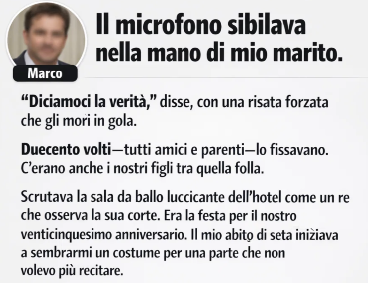 Scrutava la sala da ballo luccicante dell’hotel come un re che osserva la sua corte. Era la festa per il nostro venticinquesimo anniversario. Il mio abito di seta iniziava a sembrarmi un costume per una parte che non volevo più recitare.