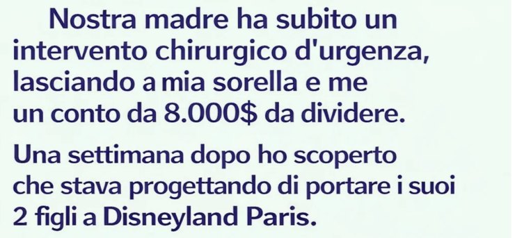 Una settimana dopo, ho chiamato mia sorella per confermare la sua parte. In sottofondo sentivo urla di bambini, e poco dopo mi ha detto con nonchalance che stava organizzando un viaggio a Disneyland Paris con i suoi due figli.