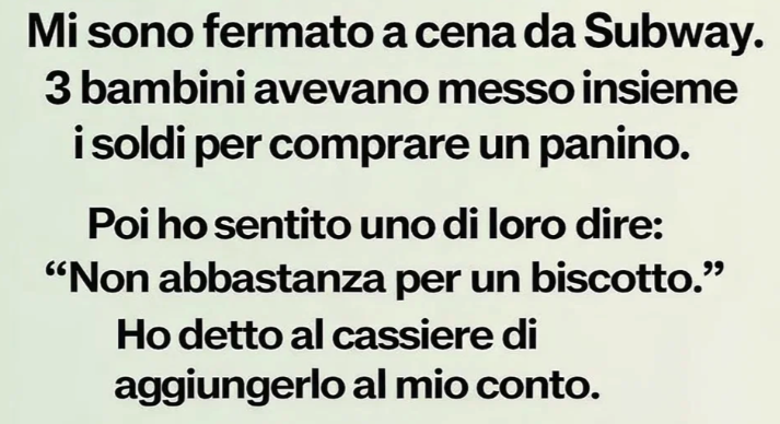 «Il mio capo li ha notati prima» ha detto piano. «Contavano gli spiccioli e sembravano in ansia. Mi ha detto di non far loro pagare. Il loro cibo è già coperto.»