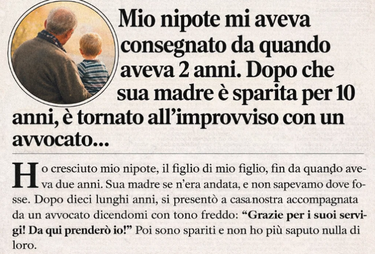 Ho cresciuto il figlio di mio figlio da quando aveva due anni. Sua madre se n’era andata. Dieci anni dopo, tornò con un avvocato e disse: “Grazie per il servizio! Da qui in poi me ne occuperò io.” Poi sparirono.