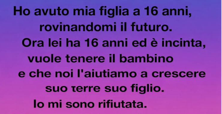Ora lei ha sedici anni, è incinta e vuole tenere il bambino, chiedendo anche a noi di aiutarla a crescerlo. Io mi sono rifiutata. Lei ha insistito, così ho messo le sue cose fuori casa.