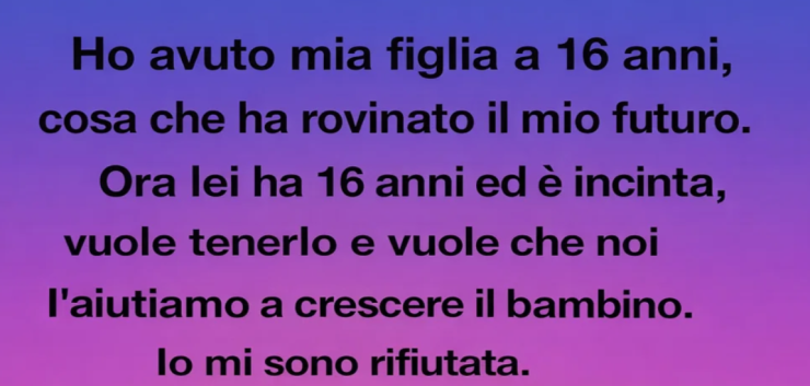 Ora lei ha sedici anni, è incinta e vuole tenere il bambino, chiedendo anche a noi di aiutarla a crescerlo. Io mi sono rifiutata. Lei ha insistito, così ho messo le sue cose fuori casa.