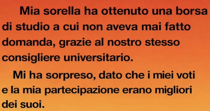 Mia sorella ricevette una borsa di studio alla quale non aveva nemmeno fatto domanda, grazie al nostro relatore universitario comune. La cosa mi lasciò senza parole: i miei voti e la mia partecipazione superavano chiaramente i suoi. Quella sera, per caso, la sentii al telefono mentre ringraziava qualcuno in modo eccessivo per un “favore”. Furiosa, la affrontai pretendendo spiegazioni. Lei si voltò, sorrise con aria furba e disse: