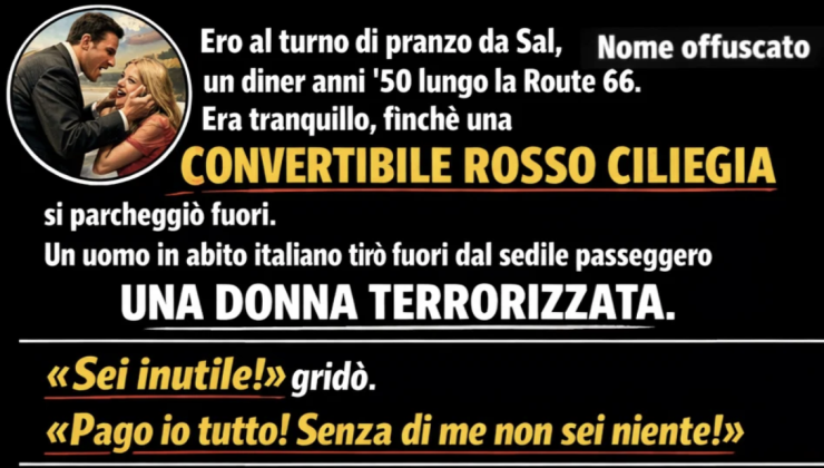 Ero al turno di pranzo da Sal, un diner anni ’50 lungo la Route 66. Era tranquillo, finché una convertibile rosso ciliegia non si parcheggiò fuori. Un uomo in abito italiano tirò fuori dal sedile passeggero una donna terrorizzata.