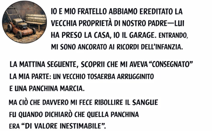 La mattina seguente, scoprii che mi aveva “consegnato” la mia parte: un vecchio tosaerba arrugginito e una panchina marcia. Ma ciò che davvero mi fece ribollire il sangue fu quando dichiarò che quella panchina era “di valore inestimabile”.