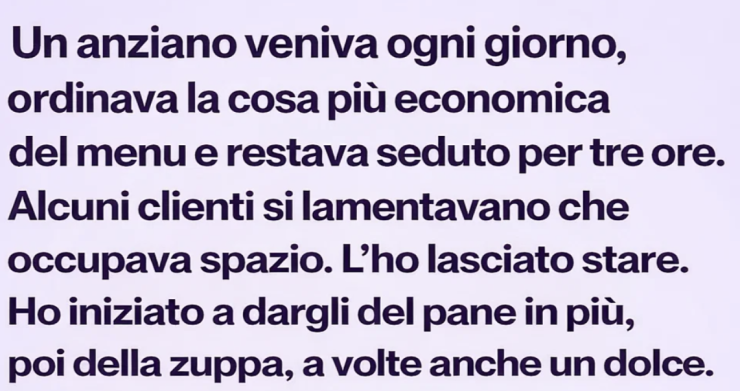 Era un uomo anziano. Sui settantacinque, forse di più. Un cappotto grigio, anche con il caldo. Un cappello che non toglieva mai, se non per appoggiarlo sul tavolo accanto a sé, come un compagno silenzioso. Si sedeva sempre nello stesso angolo, vicino alla finestra—quello che nessuno voleva perché il sole colpiva storto—e ordinava la cosa più economica del menù.