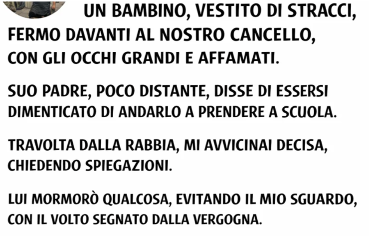 Stavo tornando a casa dal lavoro quando notai un bambino, vestito di stracci, fermo davanti al nostro cancello, con gli occhi grandi e affamati.
