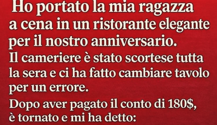 Avevo messo da parte dei soldi, scelto in anticipo le parole giuste e prenotato un tavolo in un ristorante noto per la sua atmosfera raffinata. Tutto suggeriva che fosse il luogo perfetto per un’occasione significativa: luci calde, tavola impeccabile e la promessa di un’esperienza da ricordare. Quando la mia ragazza arrivò, il suo entusiasmo era pari al mio, e per un momento sembrò che la serata si sarebbe svolta esattamente come l’avevo immaginata.